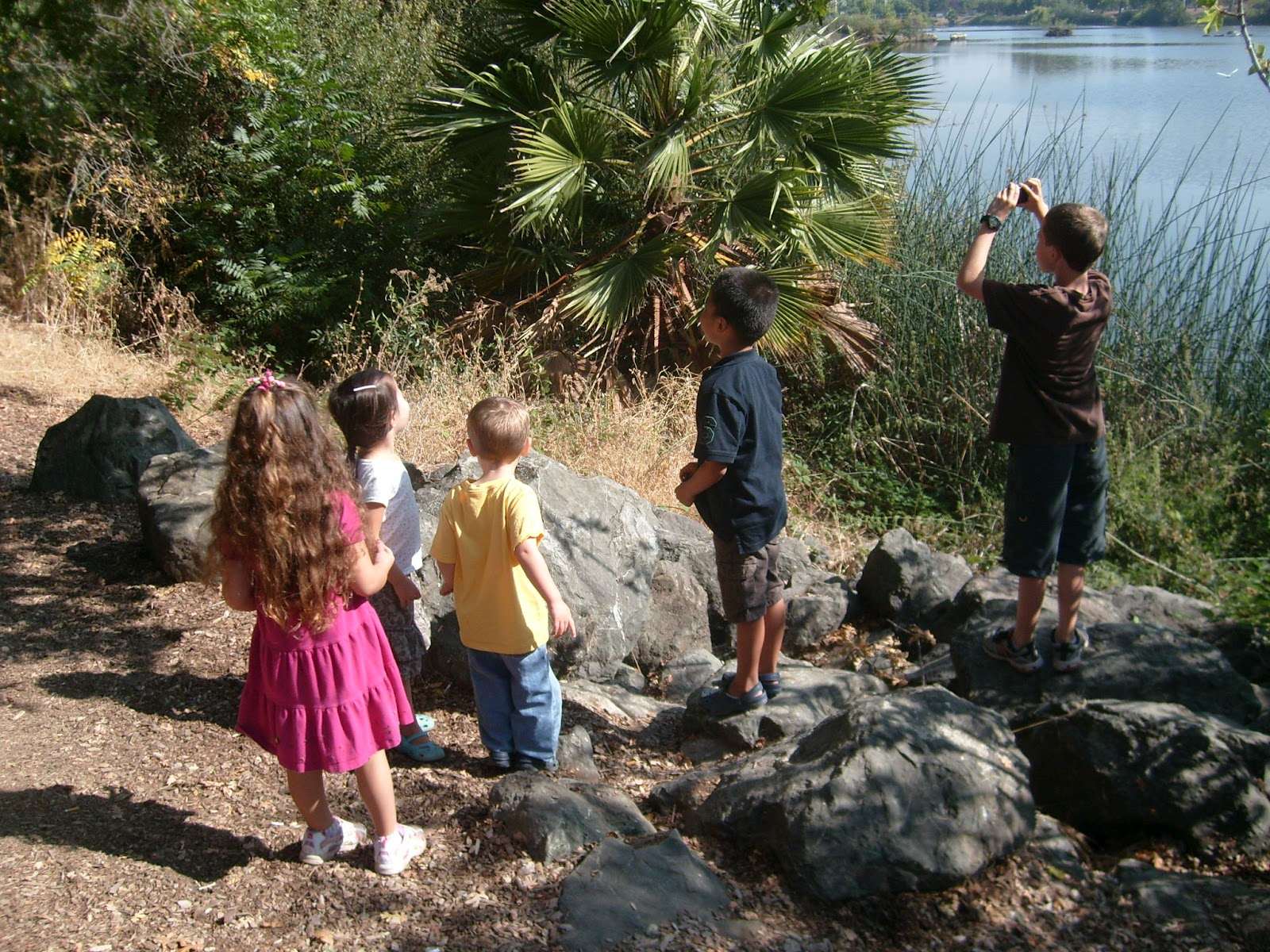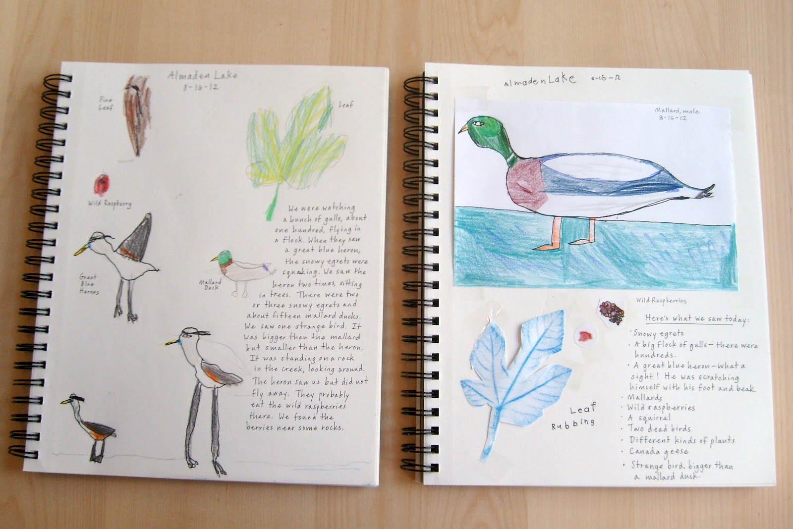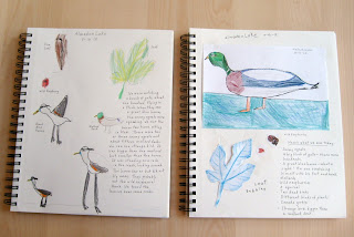 Today our local schools had their first day of the new year, but we happily spent the morning at a lake with our little nature study group. Lots of mallards, geese, and gulls, and a few other fun sightings: a pair of snowy egrets preening and squawking in the shallow water, a great blue heron perched in the tree above us, wild raspberry brambles lining the creek. The children spent lots of time exploring and a little time drawing in their journals, and then finished up on a nearby playground.
