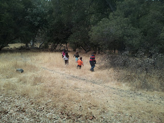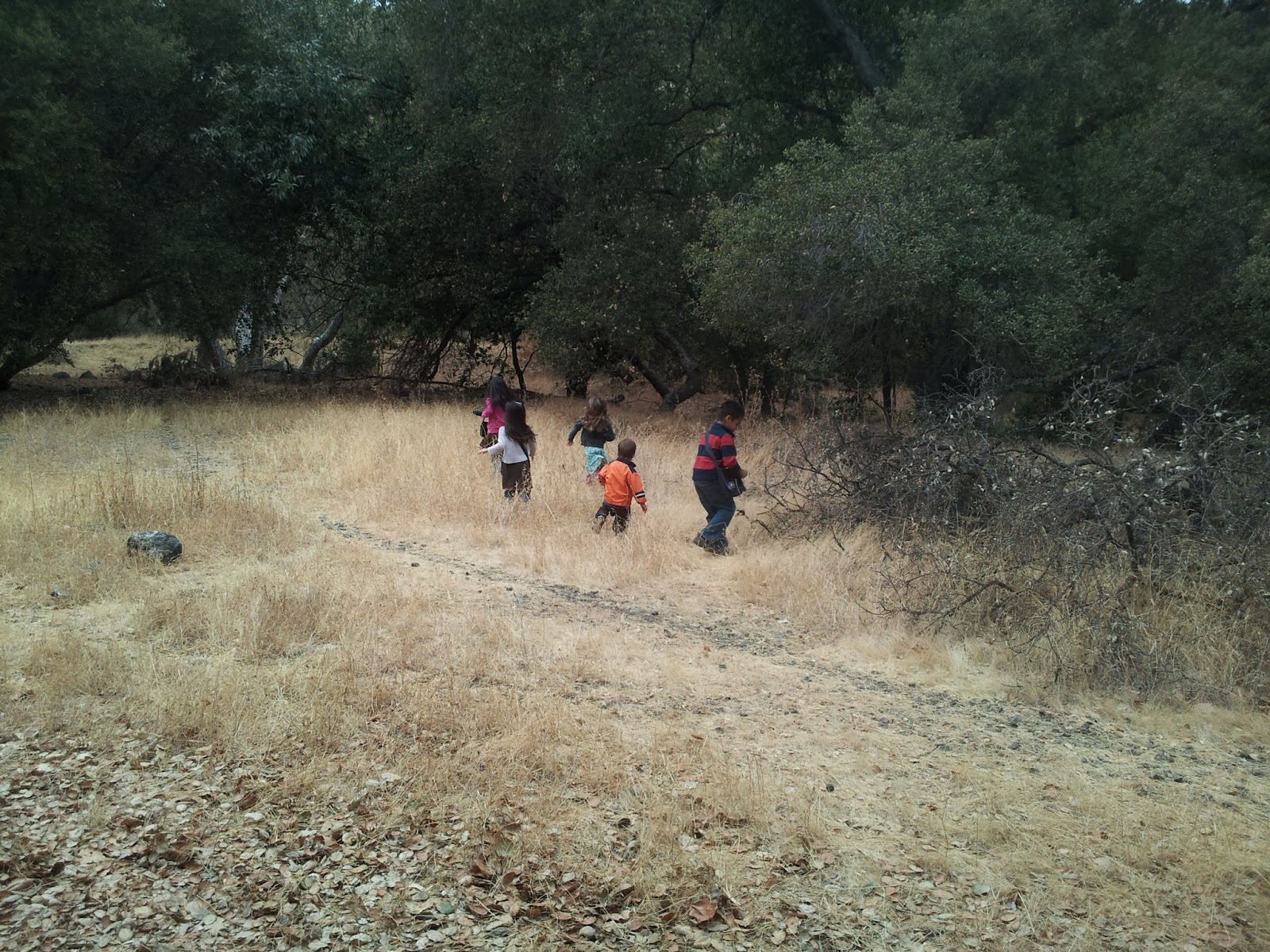Today our nature study group visited a creek that flows down from the dam of the lake we visited last week. Beyond the creek was a pond with a flock of mallards–including two friendly ducks who swam right up to us and put on a little show, diving under the water and back up again. The children had a great time watching them, picking weeds, hunting for acorns, climbing on fallen branches, exploring the pond shoreline, and playing a few games of hide-and-seek among the oaks. And we noticed a few early signs of fall: leaves changing color and cooler morning temperatures. A wonderful way to spend a Friday morning!