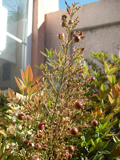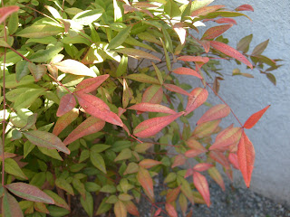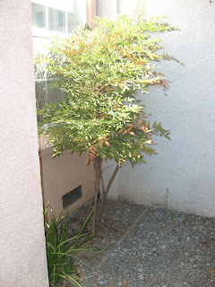I have actually been trying to identify this guy since we first moved in. It is situated right in front of one of our living room windows, so it always seems to be peeking at me through the shade, and it’s lovely green-red leaves brighten up the room. But my “green leaves red tips shrub california” searches always came up empty. When I was out in the yard the other day looking for signs of fall, I noticed it was developing berries, so I added “fall berries” to the search terms. Bingo! Nandina domestica, or heavenly bamboo: