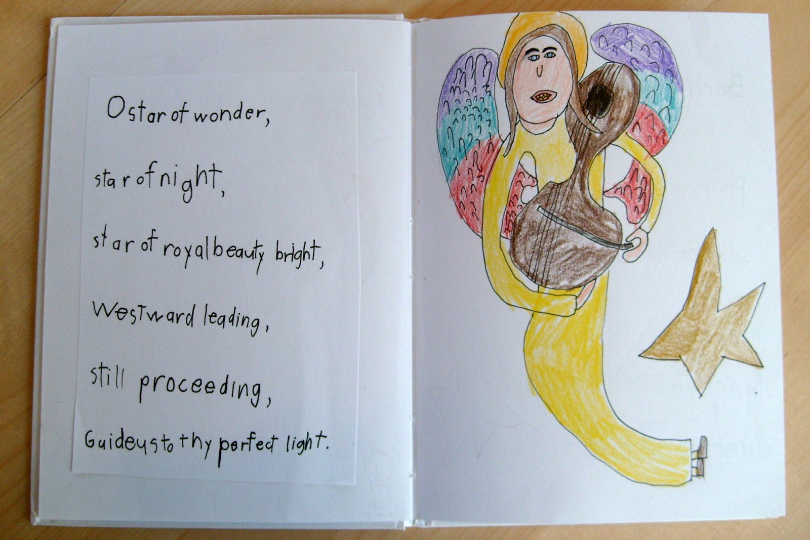Their true labor of love this year, though, was a gift from my two oldest for my husband: picture books of favorite carols.  One of the children’s favorite Christmas traditions is to do sing-alongs with my husband, turning the pages in an accompanying picture book while they listen to a carol.  We love Good King Wenceslas and Deck the Halls, but we hadn’t yet found a great version of “We Three Kings” or “I Saw Three Ships.”  (We are both very picky about picture books. ;))  So when we were putting away the Christmas books last year, the big kids told me they wanted to illustrate their own versions for Daddy’s Christmas present for the following year.  I put a couple blank books aside and pulled them out at the start of Advent for them to start working on since I knew it would be a lengthy project.  I was right–they finished the day before Christmas Eve!