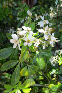 I just found out that the bushes on our side yard are popularly called Mexican Orange Blossom (Choisya ternata).  They first bloomed about a month or two ago and are starting to dry out now.  They are repeat bloomers, though, so I think we’ll have flowers all summer.