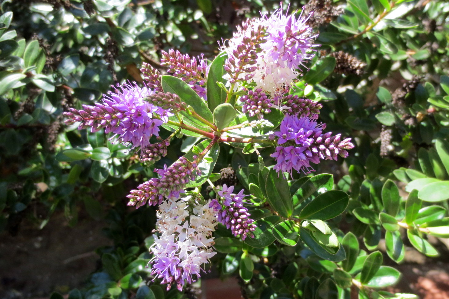I think this is a purple variety of Hebe.  It doesn’t look as nice once the flowers all dry out, but at this time of year, its subtle color and fuzzy blooms are very sweet–and a favorite place for the bees.