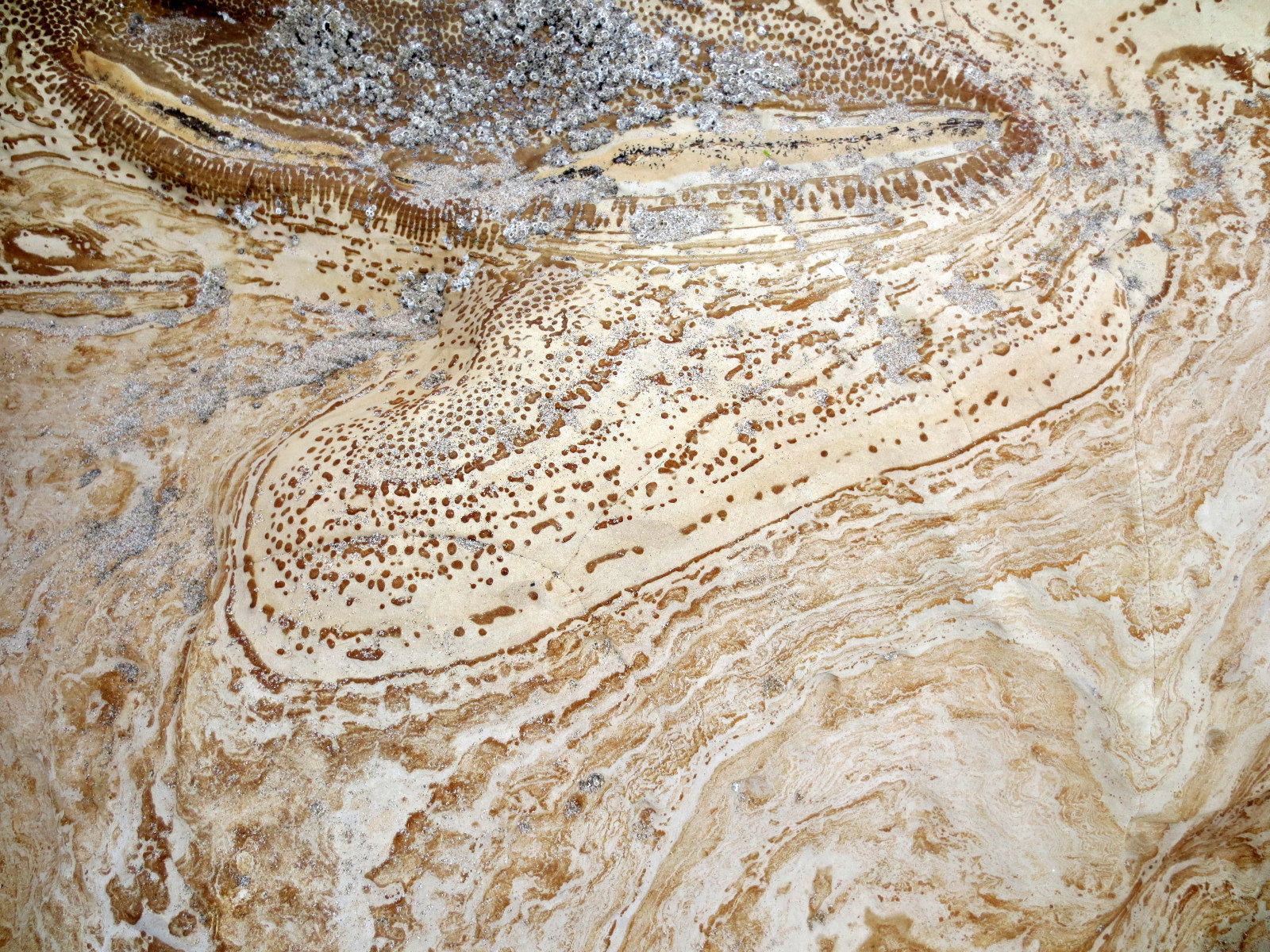 I had a great time exploring the tidepools with my two oldest.  The climb onto the rocks is easy enough even for children, and on the way, we were treated to gorgeous markings along the rocks at the beach’s west end, which are apparently formed of Santa Cruz Mudstone.  Nature’s art, indeed!
