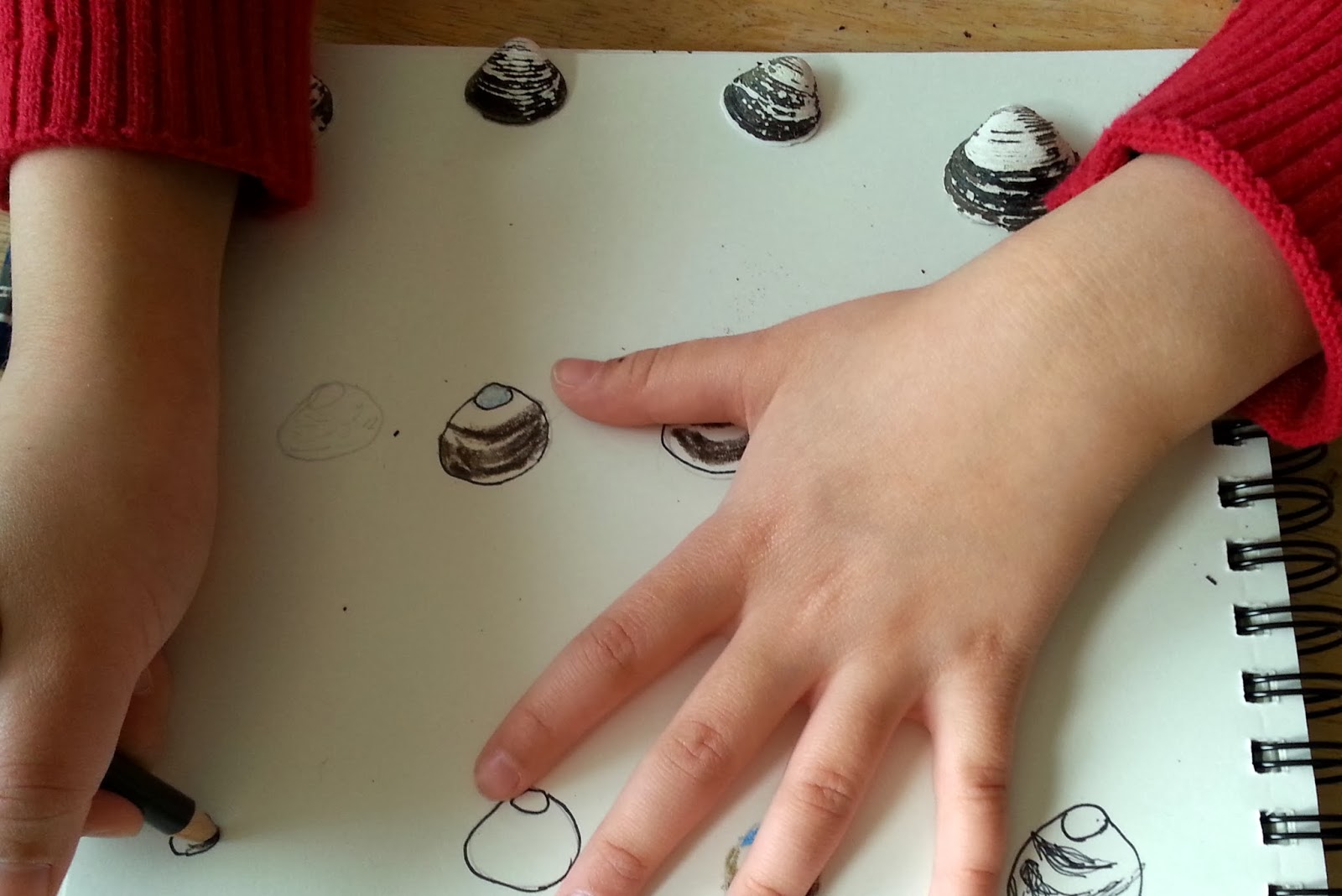 And the big sighting of the day: a Green Heron! My girls flew to me to share their discovery–they had never seen a green heron before, but they had seen enough field guides to identify at first sight. I checked online when we got home, and sure enough, green herons are less common than egrets and blue herons here, but they do frequent this lake. The kids were very happy to add it to their nature journals, as well as a sampling of the two-toned shells and the ever-present geese, coots, and mallards. Will they ever tire of drawing our local waterbirds? It seems not. 🙂