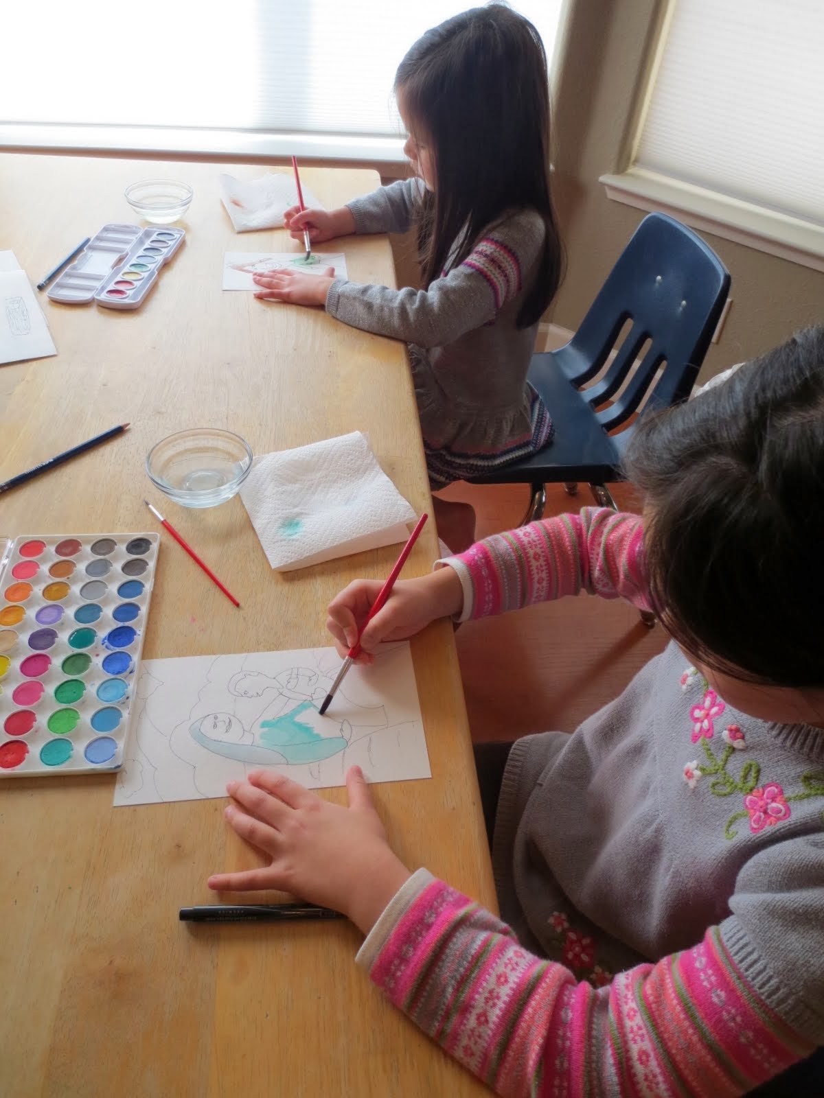 Gianna’s watercolor placecards for the Thanksgiving table at Grandma’s …and Christmas cards by the kids – drawn, printed,…