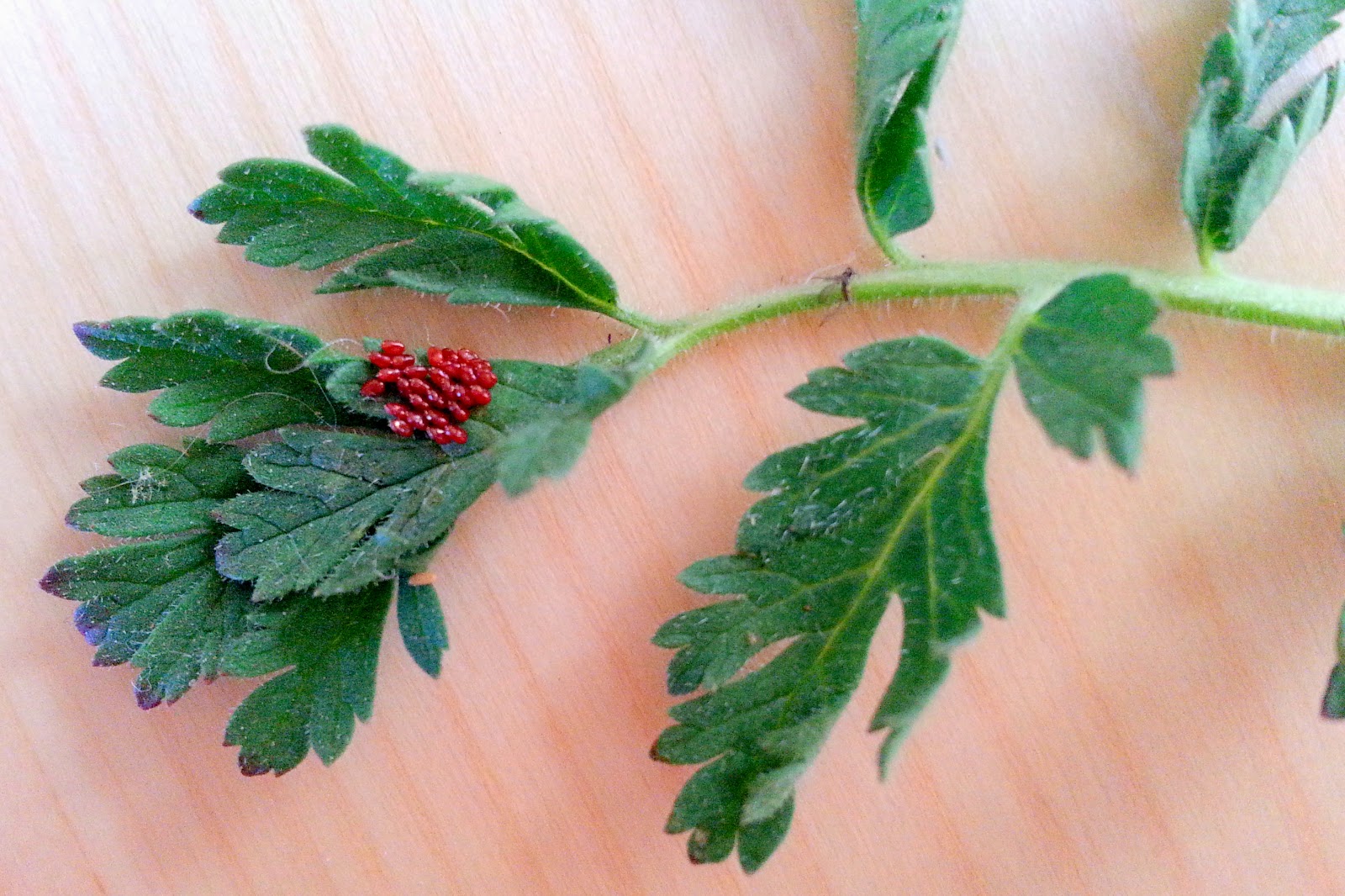 And as we were off the path, my son noticed this little group of berry-red insect eggs on a geranium leaf.