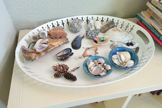 We updated our nature shelf (which morphed into a tray a few months ago) to include items from our latest nature swap and our beach trip.