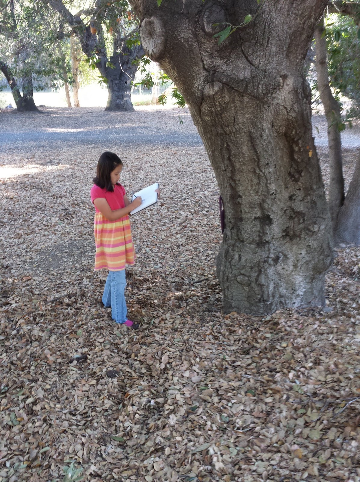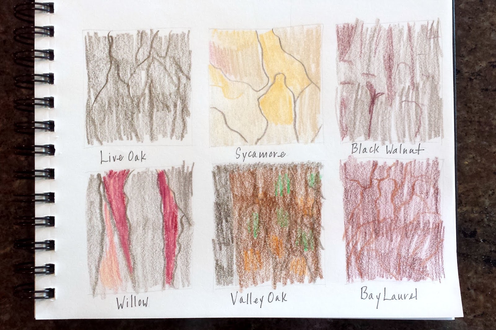 This week was one of our scheduled “tree study” days, the week of the month when our weekly nature study group does a slightly more formal observation-and-drawing session together.  This month our focus was bark.