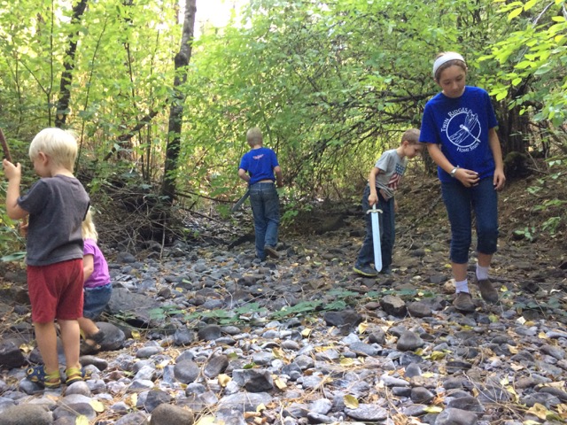 I resolved to postpone our morning time from 8 to 9 and cancel our usual morning activities to take a walk with the kids – a walk that has never gone well with all five children, as it is about a half a mile downhill to the creek, and then of course a steep half a mile back home.  I wasn’t sure what they would think of visiting the creek, dry for several months due to the drought.  Would it still be interesting if they couldn’t throw rocks in the water?  And I wasn’t sure at all how I was going to get my four year old and 21 month old back up the hill if they both fell apart.