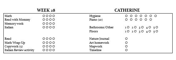 Speaking of school, we began Term 3 a few weeks ago, and as usual, I did a bit of tweaking to our schedule to start the term.  Our babymoon checklists worked perfectly during the time I needed school to be a bit more hands-off, but I was ready for something more structured now that we’re out of the newborn phase.  So we’re pretty much back to our Term 1 checklist with a few changes: