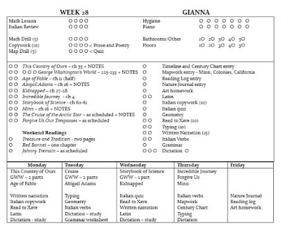 5. Your Y4 checklist looks very similar to my Y4 kiddo's. Except I do not assign specific things for each day, except Friday. I do have a spot on his list for those days. Caleb then fills in the choices for the week himself, shows me, and we discuss. I assign Fridays because we have outside commitments and I INSIST that nature study be on that day. If not, then they would fill everyday with that and other things would not get done. Ha! The rest of his list has daily things with boxes to check after each and weekly readings with their chapters and so forth.