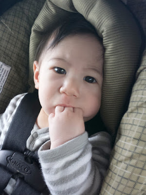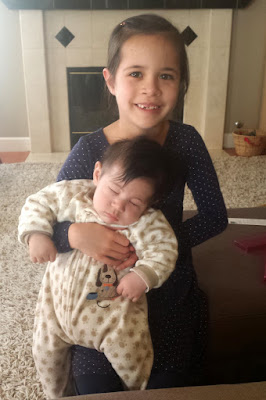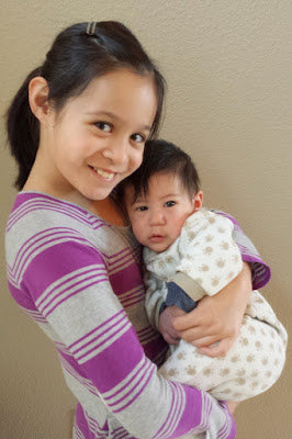 Baby Justin turned four months old!  He spends the day scooting himself backwards under sofas and chairs, chewing on his newly-found fingers, and attempting to grab his sisters’ hair with his slobbery hands…