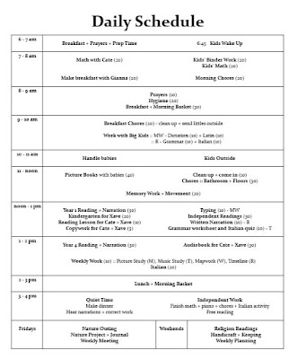 The biggest benefit to having a schedule like this is the knowledge that if I do need to make sure we stay carefully on task in a given day, I can follow this schedule and everything will get done.  With a big family, it’s valuable to know that there are indeed enough hours in the day for the items you are asking your children (and yourself!) to do.  Beyond that, there is plenty of room for flexibility within that routine.