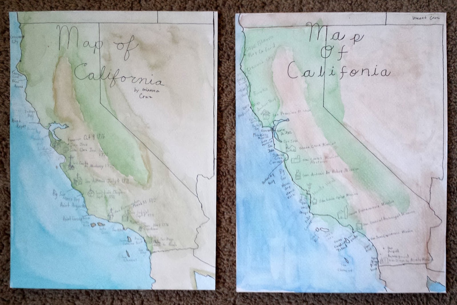 We read a California geography book this year, The Cruise of the Arctic Star, as well as a biography of Fr. Junipero Serra in Term 2.  They tracked the information from both of those readings on these blank watercolor maps they made at the beginning of the year.