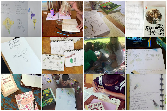 We’ve got a little of everything going on.  We’re sticking with our weekly nature journal entry but incorporating more painting and more in-the-field observations this year.  We’re all still keeping commonplace books weekly.  My younger kids still have their maps and timelines in their binders, but this year, the Big Kids’ maps and century charts are in a History Notebook, which is housing all other sorts of student-chosen bits of information: charts, narrations, timelines, and such.  It has been both fun and valuable so far, and I’ll be sharing more about that — and their Science Notebooks — here on the blog soon.  And this year, I am also keeping maps and century charts alongside them and am having a great time with that.  What are you up to?