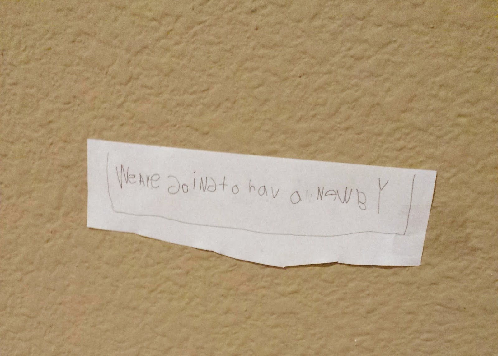 And the story behind the photo above: when we made the announcement to the kids around Thanksgiving, they were ecstatic — especially the Middles.  Xavier and Bridget immediately ran to the table and started drawing pictures and writing little announcements, grabbed some tape, and hung them up all over the house.  And they haven’t let me take them down!  So amidst our Christmas decorations are little pictures and signs.  It was the funniest reaction to a baby announcement we have ever had.